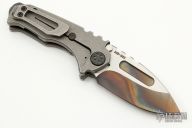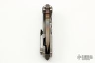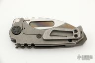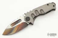 This Micro Praetorian T from Medford Knife and Tool features a Vulcan finished blade with notched thumbrest and fullers. The handle has a tumbled titanium frame with black PVD stainless steel backspacer doubles as a glass breaker, tumbled titanium clip. Comes with a Medford box, hard case and COA. Excellent condition.