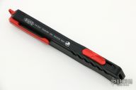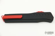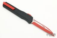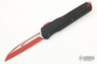 This Cypher OTF is a collaboration between Anthony Marfione and DC Monroe. It features a red standard blade with satin flats and notched thumbrest. The handle has a black anodized aluminum handle with all red hardware, and a red titanium tip down clip and a red titanium insert at the butt with lanyard hole. Comes with original box and papers. Excellent condition. 09/2018 and #0001.