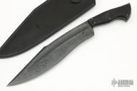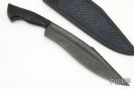 This Brute De Forge Chopper by Master Smith Jason Knight features a hand forged blade with forged fullers and bevels, the only grinding on the blade is the final edge and the swedge, otherwise it was completely forged to shape, .246" blade stock and 2.483" blade depth, full tapered tang construction. The handle has African Blackwood scales with G-10 pins. Comes with a hand tooled black leather sheath by SoulBound Leather. New from maker at the 2022 Blade Show.