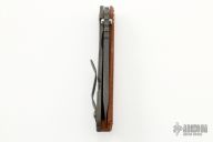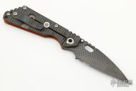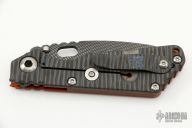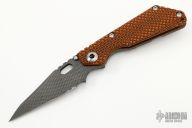 This SNG framelock folder by Mick Strider features a Grid Pattern multi-ground pike grind partially serrated blade with notched thumbrest and thumbhole. The handle has a black/orange gunner grip pattern black G-10 and flamed titanium frame and tip up titanium clip. Includes a "Lock Bar Stabilizer" for maximum reverse lock retention. Nice detent and lockup, blade is off center though. New condition.  Comes with a zippered case.