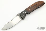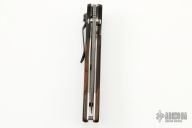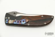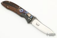 This linerlocking folder by Peter Marzitelli features a two-tone blade with bead blast flats and satin grinds, notched thumbrest. The handle has carbon fiber dovetailed bolsters, bocote scales, satin finished titanium liners, heat colored titanium clip, tip down carry. Nice detent, blade seating and lockup. Includes a COA. Excellent condition.