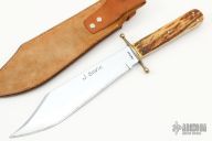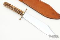 This J. Bowie by Ka-Bar features a mirror polished blade with false top edge, .150" blade stock and 1.778" blade depth, full tang construction. The handle has a brass guard and stag scales. Comes with a brown leather sheath. Has some scratches, has been sharpened, otherwise good condition.