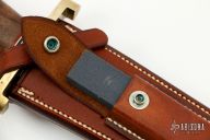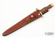 This Model 13-12 Arkansas Toothpick by Randall Made Knives features a satin finished carbon steel double edged blade with .220" blade stock and 1.506" blade depth, hidden tang construction. The handle has a lugged brass guard and butt, walnut grip with red/white/blue spacers. Comes with a brown leather sheath. Has some patina, otherwise excellent condition. "K.C. Stutz" on the blade. Made in the late 70s to early 80s.