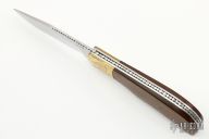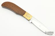 This Owl Folder features a mirror polished clip point blade with a fileworked thumbrest. The handle features engraved brass bolsters, wood scales over a file worked backspring and stainless liners. Excellent Condition.