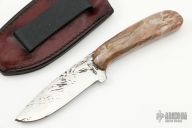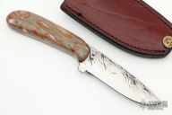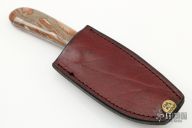 This Hunter by A. Daniel Valois features a drop point blade with a textured finish and a full tang construction. .092" Blade Stock. 1.007" Blade Depth. The handle features a stone grip. Includes a brown leather sheath.