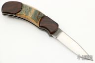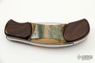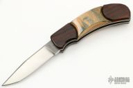 This custom auto by A. Daniel Valois features a satin finish modified tanto-style blade. The handle features wood scales over titanium liners. Excellent Condition.