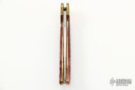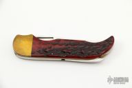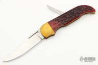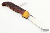 This Folding Hunter by A. Daniel Valois features a satin finish blade. The handle has brass bolsters, dyed jigged bone scales, brass liners, and a stainless steel backspacer and lever that unlocks the knife. Has good function. Has some scratches, otherwise excellent Condition.