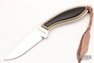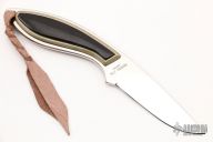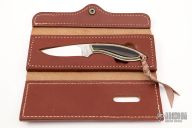 This Model 376 by Browning features a mirror polished drop point blade with ebony wood inlays in a nickel silver frame. Full tang construction with rounded spine and tang. High polished Japanese stainless blade is .155" thick and .892" deep. Comes with very nice fold-over leather case. Has a little patina on the nickel silver, otherwise excellent condition.