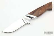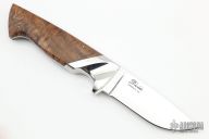 This Kindal Hunter by D'Alton Holder features a mirror polished blade with .192" blade stock and 1.093" blade depth, full tapered tang construction. The handle has 416SS bolsters, curly koa wood scales with nickel silver liners. Comes with a zippered case. Has a few light scratches, otherwise excellent condition.
