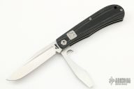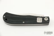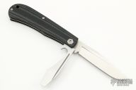 This Two-Blade Slipjoint (Cap Lifter) by Nick Swan features a blasted blade with fullers and a second "blade" with bottle opener and pry tip. The handle has black G10 covers with stainless steel liner and Craft Brew Junkies escutcheon. Comes with COA dated 02/2018, and Double Swans Fox Hanx kerchief. One mark on the bottle opener, excellent condition otherwise.