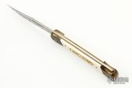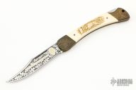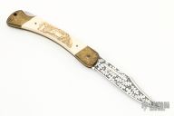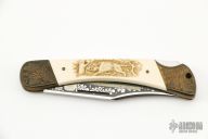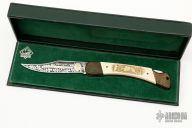 This knife by Puma Knives features a clip point blade with a single nail nick. The handle features brass bolsters/frame with carved interior ivory scales. Includes a green padded display case. Excellent condition.
