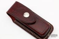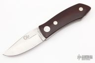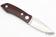 This Barry Wood design swing lock folder features a satin finish blade and satin finish stainless steel frame with maroon linen micarta scales. This is a very unique scissor opening folder, which when the blade is fully open and locked in place is almost a fixed blade knife. The handle is nicely contoured for a comfortable grip. Opening is accomplished by lighting pressing down and outward at the rear indentation on the spine, which releases the locking pin and allows one side of the handle and the blade to rotate down then forward until the blade locks in the forward position. The one side of the handle continues to rotate back until it locks in place. Closing requires the same slight thumb pressure at the indentation to release the locking pin, then the one side of the handle is rotated back and around, catching the blade and aligning both with the other side of the handle in a locked closed position.  Comes with a leather Colt belt sheath and the original box.  Excellent Condition.