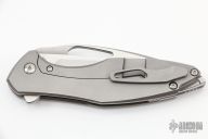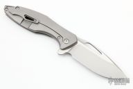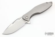 This Arius Flipper by Koenig knives features a burnished with PF blade with thumbhole and flipper. The handle has a bead blasted and C-pattern milled titanium frame satin titanium backspacer and a bead blasted tip up clip with hidden screws. Has ceramic bearings and a ceramic detent ball. Nice detent, lockup and blade seating. Comes with original box and COA dated September 5, 2022. New from maker.