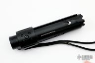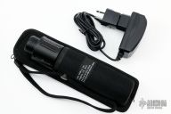 Unique design with flashlight and knife in one package. Knife blade is curved to the contour of the light body. Twist to push open and twist to lock. Blade has gut hook and serrations.  Comes with charging cord with American and European Adapters. Comes with original box, sheath and papers. New From Maker. Blade Steel: 440A