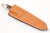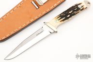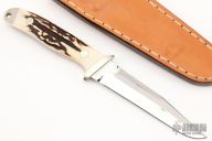 This Boot Knife by Dave McDearmont features a mirror polished blade with sharpened top edge, .179" blade stock and .981" blade depth, full tapered tang construction. The handle has a nickel silver guard and rear bolsters, stag scales with nickel silver pins and red liners. Comes with a brown leather sheath with boot clip. Has a little patina on the fittings, otherwise excellent condition. This knife was featured on the cover of Knives Illustrated from Winter of 1988 and comes with a copy.