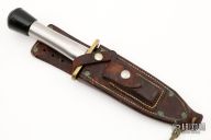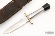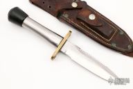 This Vietnam Era Solingen Randall Model 18-5.5 Crutch Tip by Randall Made has a stainless steel blade with sawteeth, .211" blade stock and 1.233" blade depth, hidden tang construction. The handle has a brass guard, and stainless steel handle, this knife has the original "Crutch Tip", there is no threaded butt cap, just a crutch tip covering the hollow handle. Comes with original brown leather sheath. Has some scratches, has been sharpened, otherwise good condition for its age. This knife was owned by a Vietnam Veteran, we are not sure whether or not he carried it in the theater, but it is possible, especially if you look at the sheath.
