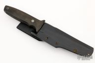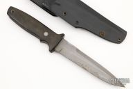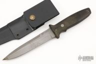 This Model 30 Battle Guard by Bob Terzuola features a bead blasted spear point blade with a sharpened top edge and notched thumbrest, .190" blade stock and 1.135" blade depth, hidden tang construction. The handle is black linen micarta with non-slip grip on the bottom of the handle and a lanyard hole. Comes with kydex sheath. Has scuffs and scratches, has some oxidation on the blade, otherwise good user condition.