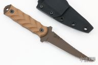 This Combat Fillet Knife by Half Face Blades features a bronzed blade with a textured blade spine with a full tang construction.  .165" Blade Stock.  1.007" Blade Depth.  The handle has tan G-10 sculpted scales. Comes with kydex sheath with belt clip. Excellent Condition.