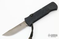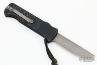 This OTF automatic by Rob Dalton features a bronzed and bead blast blade and black milled aluminum handle. Titanium clip. Fires via push button and retracts by holding the button and moving the slider on the side of the knife. Has tritium inlay in the push button. Very powerful action. Has scratches and scuffs, otherwise good condition. F00427