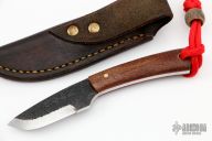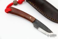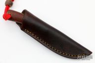 This knife by Jones Knives features a hammer finished drop point blade with .156" blade stock and .875" blade depth, full tang construction. The handle has micarta scales with brass pins and red liners. Comes with a brown leather sheath and Velcro pouch. Has some light scuffs and scratches, great condition otherwise.