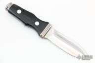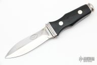 This is a very attractive boot knife from AG Russell. This is the older model made in Solingen, Germany. Blade is .099" thick and .908" deep at the ricasso and double-edged. Scales are black linen micarta. Integral construction with aluminum pins. Has some light scratches, otherwise good condition.