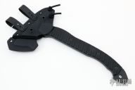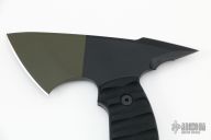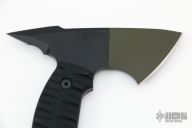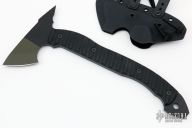 This Bleeding Heart Tomahawk by Half Face Blades features a 2.5" blade with spike at the rear, .219" blade stock, full tang construction. The handle has black G-10 scales. Comes with a kydex sheath. Excellent condition.