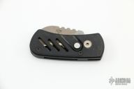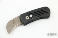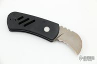 This Pocket Hawk side-opening automatic by Rob Dalton has a bronzed partially serrated blade and black aluminum frame. Strong and fast coil-spring opening. The blade is chipped.  Scuffs/scratches are visible on the blade and handle otherwise the knife is in working condition.