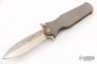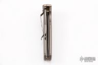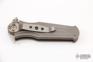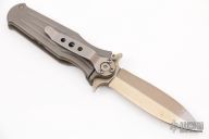 This knife by A.G. Russell features a tumbled bronzed spear point blade with a false top edge and dual notched thumbrest.  The handle has a bead blasted titanium frame with a stainless steel tip down carry.  Scuffs, scratches and oxidation is visible on the knife otherwise the knife would make a good user.