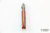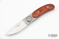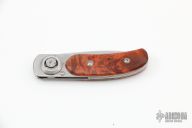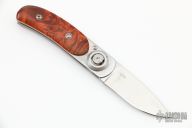 This Paul Pocket Knife features the Paul Poehlmann axial locking mechanism. Opens by depressing the button on the backside and rotating the face side dial. Closes the same way, rotating the dial in the opposite direction. The handle has burlwood scales over stainless steel liners and backspacer.  Includes original box, leather sheath.  Oxidation is visible on otherwise the knife is in good condition.