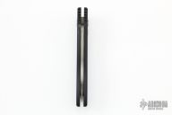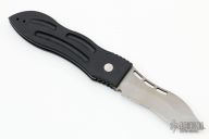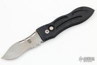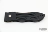 This Serpent side opening automatic by Rob Dalton features a recurve bead blast blade with partially serrated edge. The handle has a black aluminum frame with flutes. Has some scuffs, the clip is missing, otherwise excellent condition.