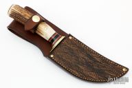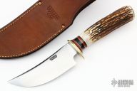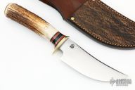This Hunter by Jim Behring features a satin finished and convex ground blade with a false top edge, .154" blade thickness and 1.525" blade depth, hidden tang construction. The handle has a brass guard and cap, pinned sambar stag grip, black/red/brass/micarta spacer pattern. Great look and feel. Comes with brown leather sheath with premium sharkskin panel. New from maker!