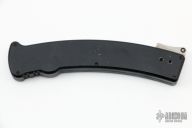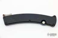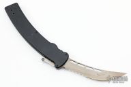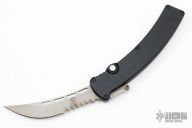 This Scorpion by Rob Dalton features a bead blasted partially serrated blade and black aluminum handle. Fires via push button and retracts by holding the button and moving the slider on the side of the knife. Has scuffs and scratches and stains, the clip is missing, otherwise good user condition.