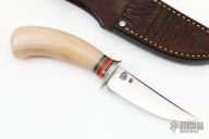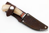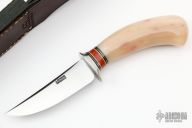 This Musk Ox Caper by Jim Behring "Treeman" features a convex ground satin finished blade with .099" blade stock and .863" blade depth, hidden tang construction. The handle has a sterling silver guard with atooth grip, black/red/yellow/blue spacer pattern. Comes with a brown leather sheath with shark panel. New from maker!