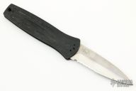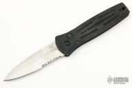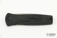 This 3550 Mel Pardue designed side opening auto from Benchmade has a satin spear point partially serrated blade with a false top edge. Handle is matte black finished aluminum with milled contours and a spine-thumb safety button. Has scratches and scuffs but would make a good user.