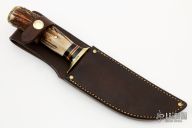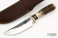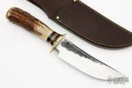 This Hunter by Jim Behring features a satin finished and hammer marked hollow ground blade with a false top edge, .241" blade thickness and 1.56" blade depth, hidden tang construction. The handle has a brass guard, vintage sambar stag grip, micarta/brass/red spacer pattern, and brass butt. Great look and feel. Comes with brown leather sheath.New from maker!