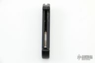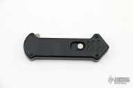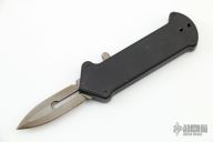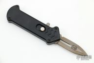 This OTF automatic features a double-edged bead blast blade and milled aluminum handle. Fires via push button and retracts by holding the button and moving the slider on the side of the knife. Has some light scuffs, the clip is missing, otherwise excellent condition.