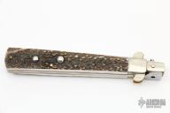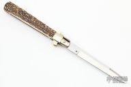 This Picklock by AGA Campolin features a satin polished bayonet ground blade with false top edge. The handle has nickel silver bolsters, stag scales, brass liners and a stainless steel backspacer/lock. Has some light scuffs and scratches, great condition.