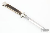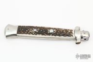 This swivel bolster by AGA Campolin features a satin polished bayonet ground blade with false top edge. The handle has nickel silver bolsters, stag scales, brass liners and a stainless steel backspacer/lock. Has some light scuffs and scratches, great condition.