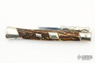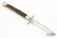 This Swing Guard by AGA Campolin features a satin polished bayonet ground blade with false top edge. The handle has nickel silver bolsters, stag scales, brass liners and a stainless steel backspacer/lock. Has some light scuffs and scratches, great condition.