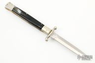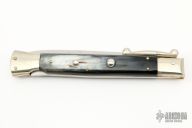 This Swing Guard by AGA Campolin features a satin polished bayonet ground blade with false top edge. The handle has nickel silver bolsters, buffalo horn scales, brass liners and a stainless steel backspacer/lock. Has some light scuffs and scratches, great condition.
