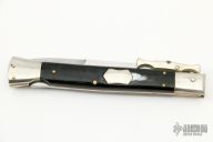 This Swing Guard by AGA Campolin features a satin polished bayonet ground blade with false top edge. The handle has nickel silver bolsters, buffalo horn scales, brass liners and a stainless steel backspacer/lock. Has some light scuffs and scratches, great condition.