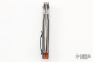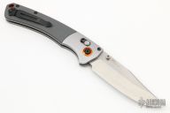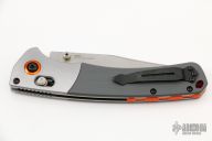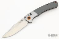 This 15080-1 Crooked River is part of the Benchmade Hunt series. It features a satin finished bowie style blade with swedge and dual thumb studs. The handle is comprised of titanium bolsters and gray G10 scales over steel liners and orange G10 backspacer. Orange anodized aluminum pivot collar and AXIS lock. The black coated stainless steel pocket clip is reversible for left or right hand tip up carry. Excellent condition.