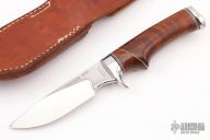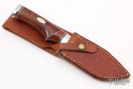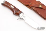 This Hunter by Ruffin Johnson features a mirror polish blade with .166" blade stock, 1.052" blade depth, hidden tang construction. The handle has a stainless steel guard and butt, stacked wood grip with black/white/nickel silver spacers. Comes with a brown leather sheath. Excellent condition. Blade is marked "Decembwer 1980"