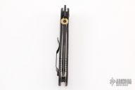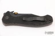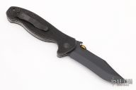 This Patriot by Emerson Knives features a black clip point recurve blade with .45 auto thumbdisc and wave feature, also has notched thumbrest. The handle has black G-10 scales, titanium liners, and black standoffs. Black stainless steel clip, tip up carry. Scuffs and scratches are visible on the handle otherwise the knife is in excellent condition.