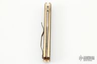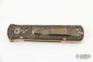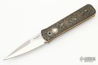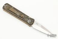 This Godson Custom by Protech features a satin polish blade. The handle features a bronze aluminum frame with engraving by Andrew Lee Adams and a MOP push button. Includes original box and papers. Excellent condition.