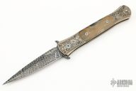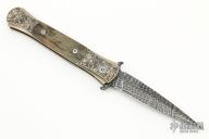 This Don Ultimate Titanium Custom by Protech was engraved by Bruce Shaw. It features a Chad Nichols mosaic high carbon Damascus blade. The handle has an anodized titanium frame with ancient bark mammoth ivory inlays and a mosaic pin push button. Comes with original box and papers. Excellent condition.