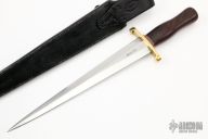 This Model 13-12 Arkansas Toothpick by Randall Made Knives features a satin finished carbon steel double edged blade with .213" blade stock and 1.609" blade depth, hidden tang construction. The handle has a lugged brass guard, rosewood grip with red/white/blue spacers. Comes with a black leather sheath. Has a few light scratches, otherwise excellent condition.
