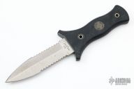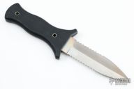 This Ninja by Benchmark Knives features a satin finished double-edged partially serrated blade with .150" blade stock and 1.012" blade depth, hidden tang construction. The handle is black zytel. Oxidation is visible on the blade otherwise the knife is in good condition.
