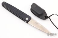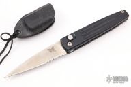 This Spike automatic by Benchmade Knives features a satin finished partially serrated blade and black anodized aluminum frame. Oxidation is visible on the blade. Includes a kydex neck sheath. Scratches are visible on the frame otherwise the knife is in good condition.