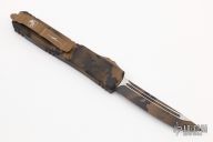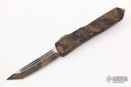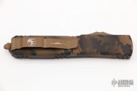 This Ultratech OTF automatic by Microtech features a T/E blade with a standard edge. Stainless steel clip. Glass breaker. Coyote Camo aluminum handle with glass breaker. Dated 04/2022 and serial number 064. Excellent condition. Comes with original box and papers.